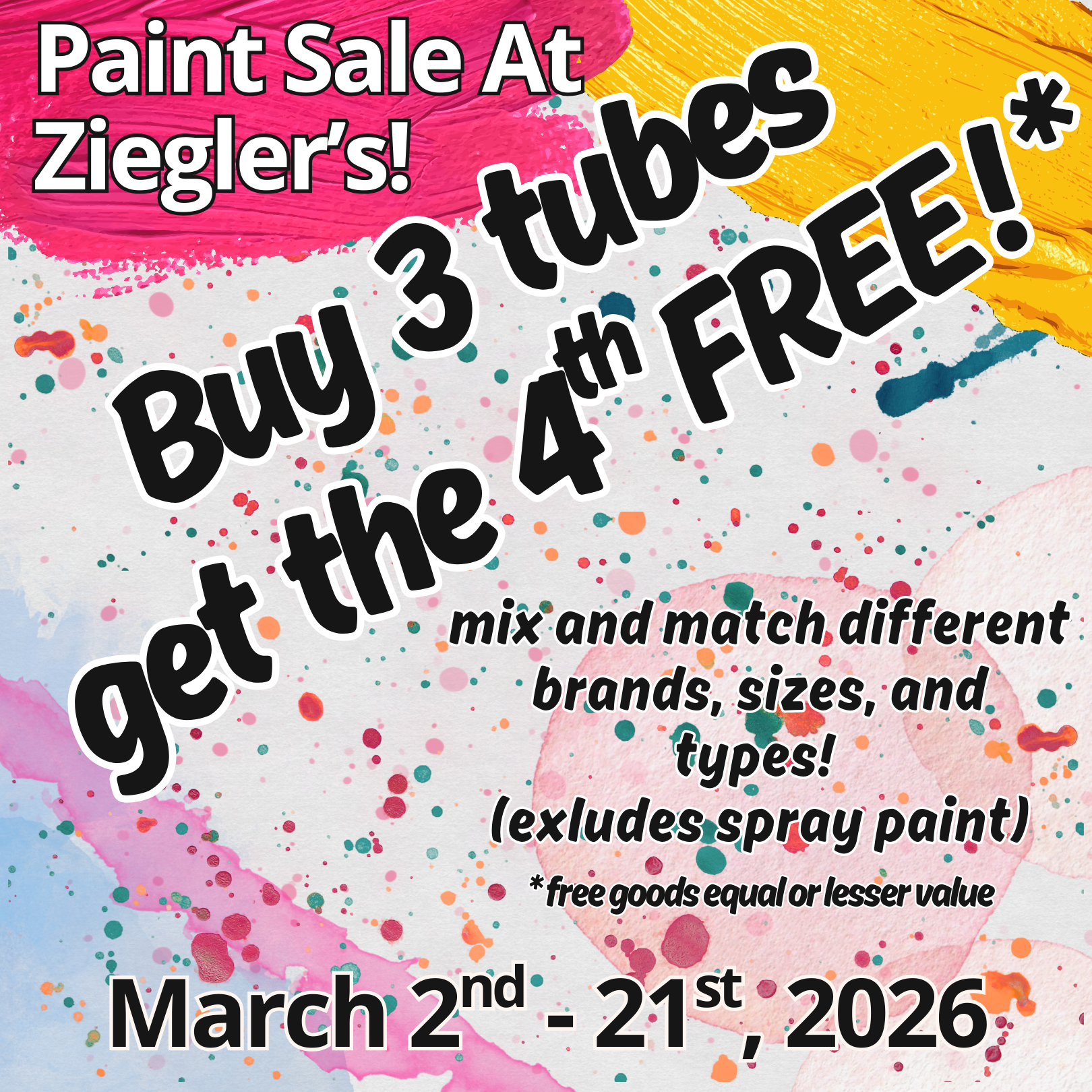 Buy 3 paint tubes, get the 4th free (free goods equal or lesser value)! Excluding spray paint, you can mix and match all kinds of paints: watercolor, acrylic, or oils, you name it!